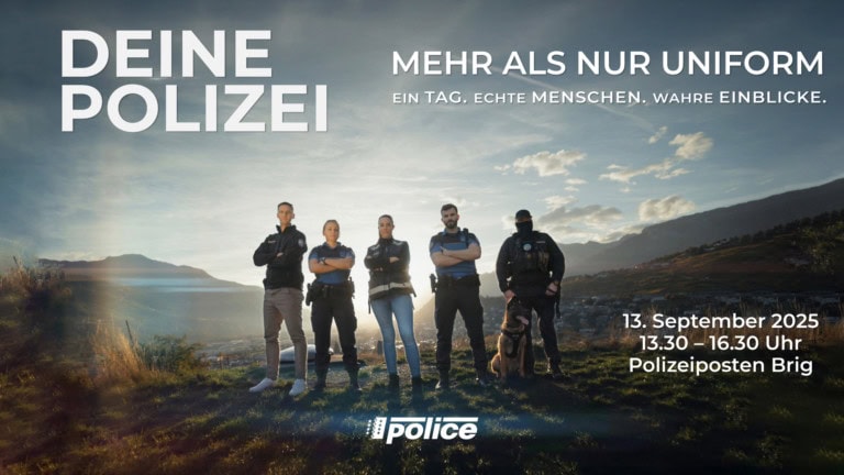 Am Samstag, 13. September 2025, lädt die Kantonspolizei im Polizeiposten Brig von 13.30 bis 16.30 Uhr die gesamte Bevölkerung herzlich zum Tag der offenen Tür ein.