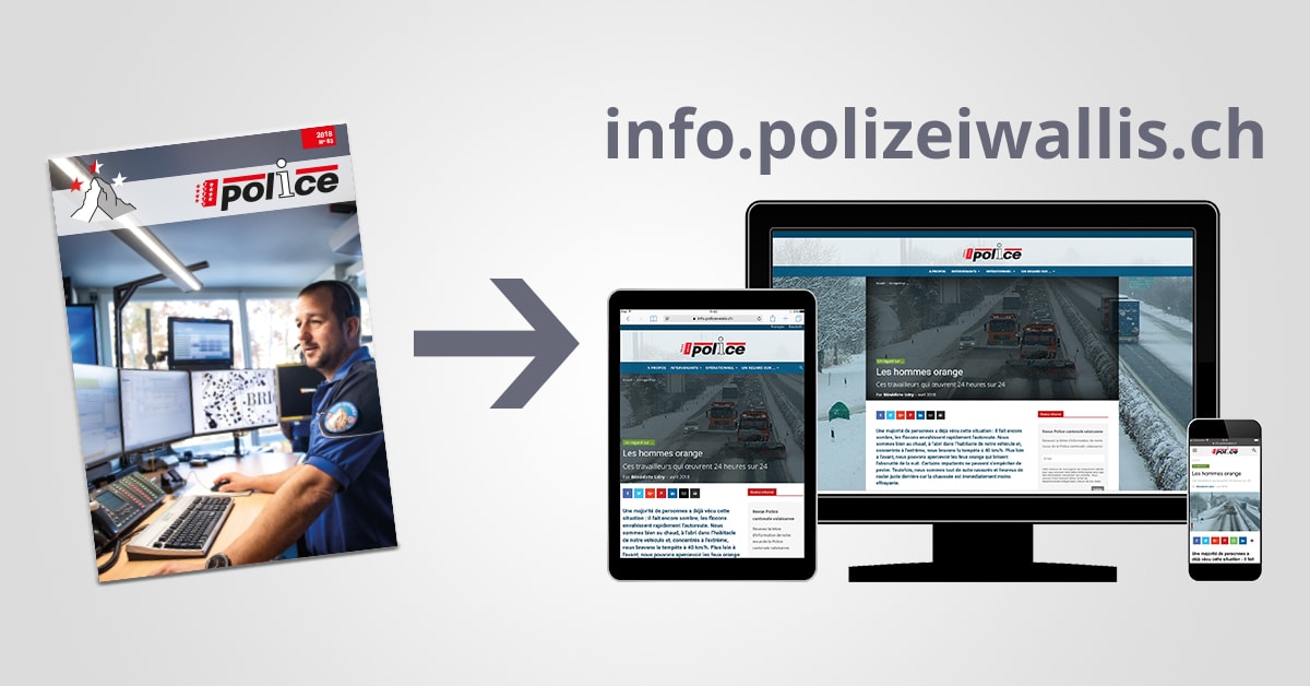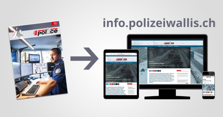 Unsere Kommunikation wird noch näher an Sie herangeführt, da Sie mit einem Klick auf Ihren Computerbildschirmen, Tablets und anderen Mobilgeräten verfügbar ist. Die Internetseite info.polizeiwallis.ch ersetzt damit das Magazin „Police“. Unser Newsletter informiert Sie regelmässig über Projekte und Aktivitäten innerhalb unseres Korps.