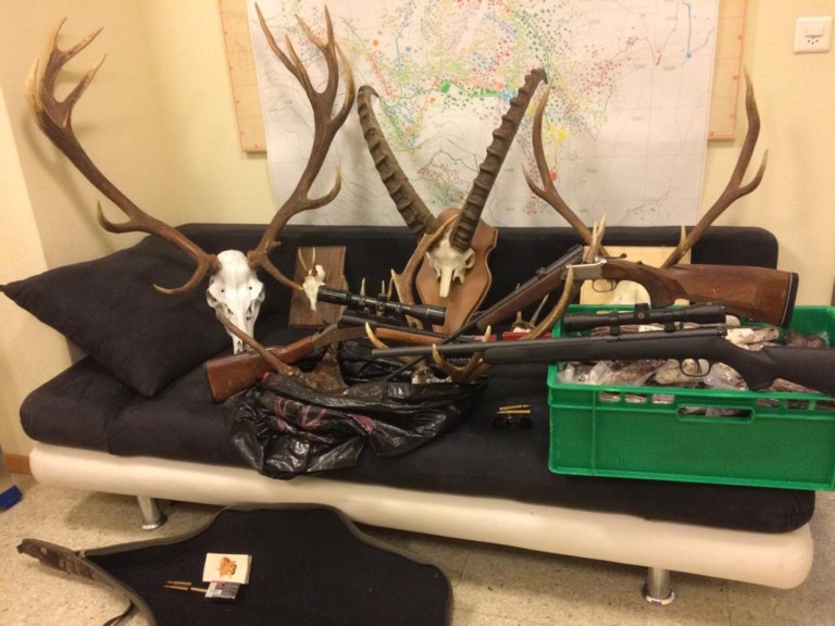 Bei mehreren Hausdurchsuchungen stellten die Agenten Trophäen sowie mehrere Dutzend Kilo abgepacktes Fleisch sicher. Daneben wurden auch Schusswaffen, Waffenzubehör und Munition beschlagnahmt.