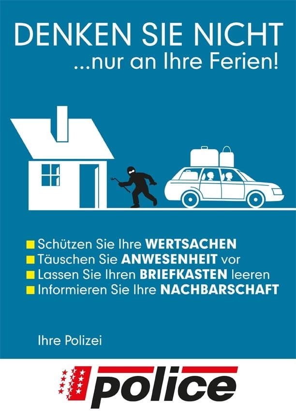 Bald ist Ferienzeit. In den nächsten Tagen und Wochen werden viele Familien in die Ferien verreisen. Wohnungen und Häuser sind unbewohnt und daher ein beliebtes Ziel für Einbrecher. Um sich gegen Einbruchdiebstähle zu schützen möchte die Kantonspolizei Wallis Ihnen einige Ratschläge in Erinnerung rufen.