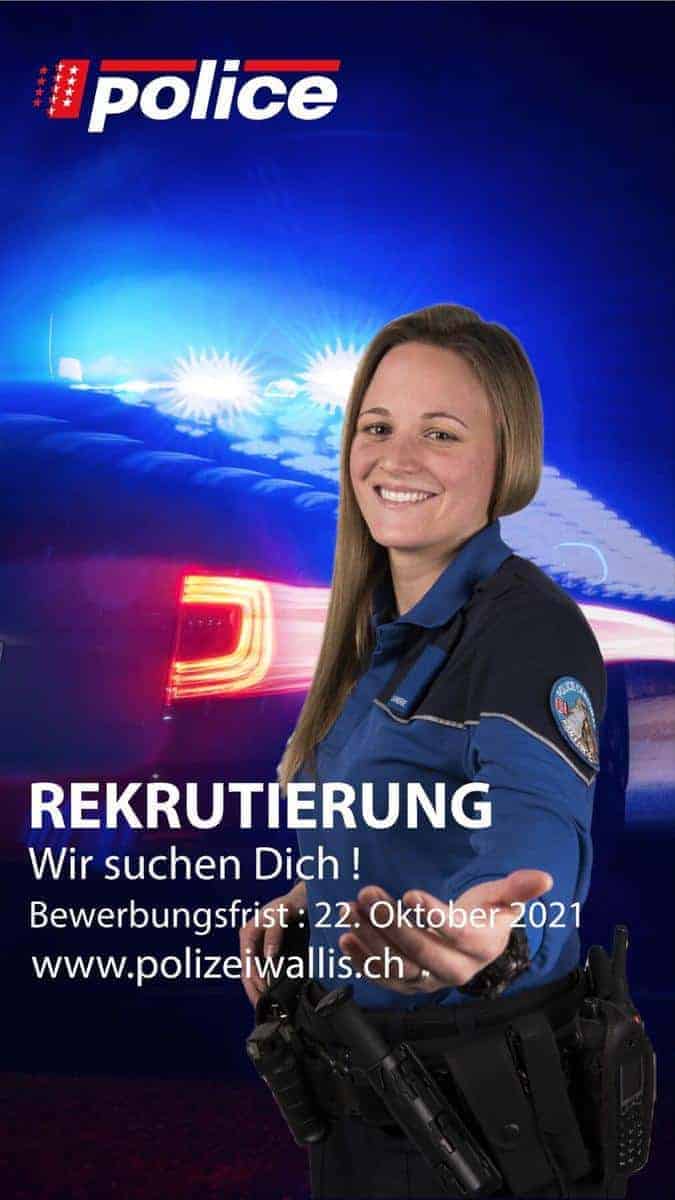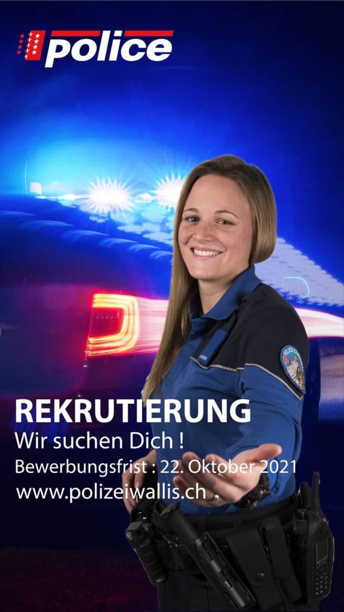 Die Rekrutierungskampagne der Walliser Kantonspolizei wird am Donnerstag, 23. September 2021, gestartet. Der ideale Job für alle, die eine abwechslungsreiche, spannende Tätigkeit im Dienste der Bevölkerung suchen.