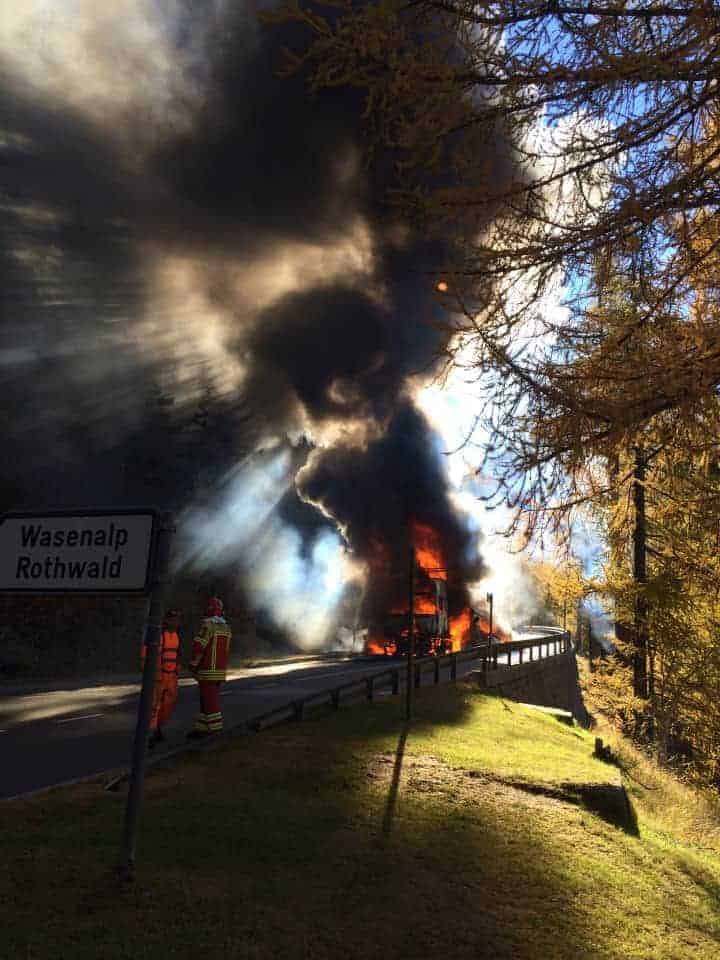 Ein 46-jähriger rumänischer Chauffeur fuhr mit einem in Polen immatrikulierten Lastwagen mit Anhänger auf der Simplonpassstrasse von Gondo in Richtung Brig. Beim Rothwald  bemerkte der Lenker eine Rauchentwicklung im Motorraum und hielt an. Die Flammen griffen auf den Anhänger über. Der Lastwagen sowie der Anhänger, welche mit Waschmaschinen beladen waren, wurden durch den Brand vollständig zerstört. Die aufgebotene Feuerwehr von Rid-Brig mit Unterstützung der Stützpunktfeuerwehr von Brig und der Feuerwehr von Naters, hatten den Brand um 11:10 unter Kontrolle. Der Simplonpass bleibt bis zum Abtransport des ausgebrannten Lastwagens mit Anhänger für jeglichen Verkehr gesperrt. Um die Brandursache abzuklären wurde eine Untersuchung eingeleitet. Aufgebotene Einsatzkräfte: 50 Feuerwehrleute – Kantonspolizei.