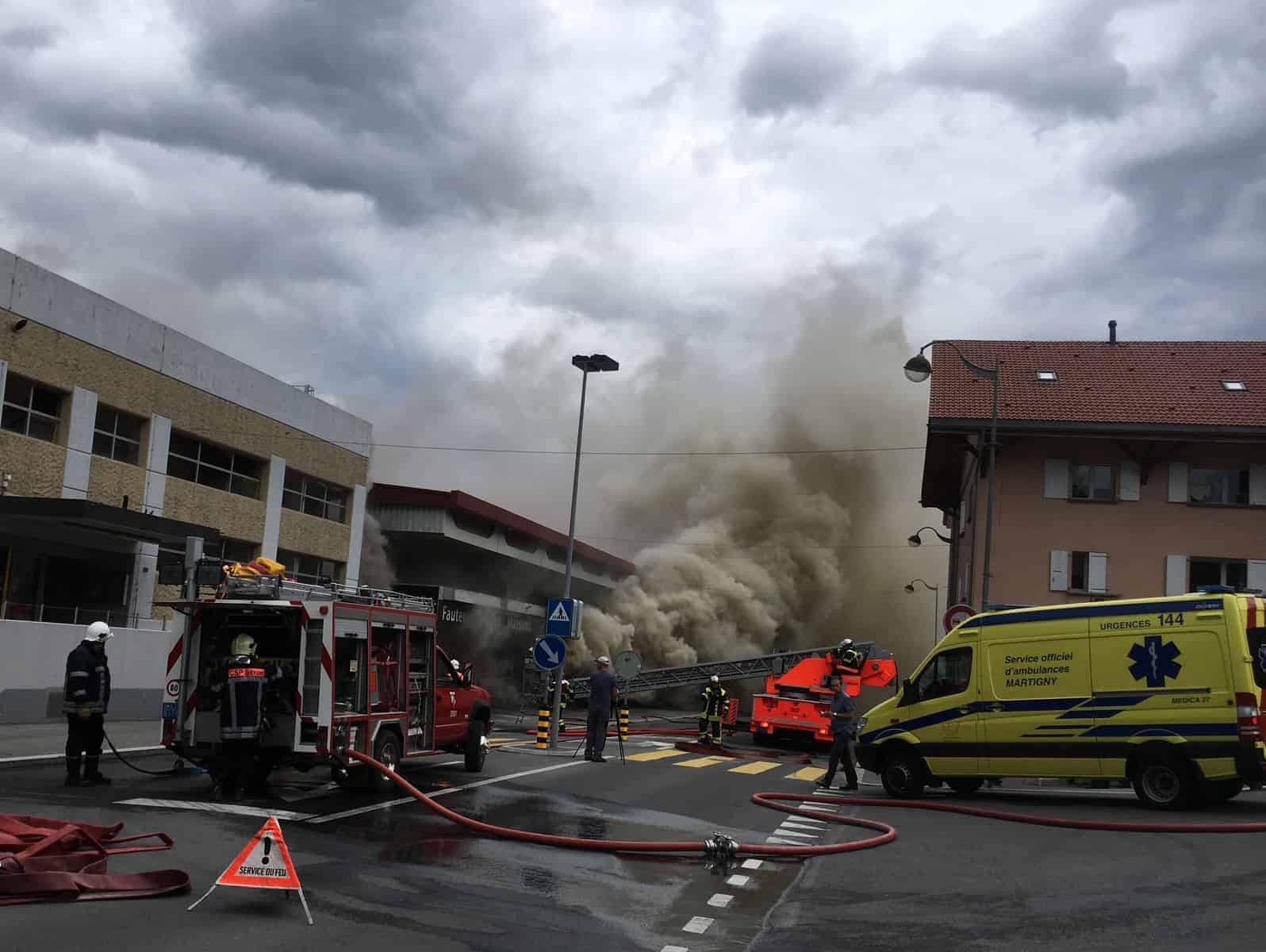 Am 8. Juni 2016 um 15:03 wurde der Einsatzzentrale der Kantonspolizei über die Notrufnummer 118 ein Brandausbruch im Untergeschoss eines Gebäudes an der Route de Gotteffrey in Saxon gemeldet. Die Feuerwehr von Saxon begab sich unverzüglich vor Ort und erhielten von der Feuerwehr des Deux-Rives und von Martinach Unterstützung. Die Feuerwehr von Monthey wurde ebenfalls aufgeboten und setzten einen zweiten Hochleistungslüfter ein um in das Untergeschoss zu gelangen. Nach ersten Informationen brach das Feuer im Untergeschoss einer Mehrzweckhalle aus und breitete sich im Anschluss auf ein anderes Gebäude aus. Die besetzten Büroräumlichkeiten in den oberen Stockwerken wurden evakuiert. Die Löscharbeiten gestalteten sich schwierig, da in einem angebauten Gebäude eine grosse Menge Papier und Karton gelagert wurden. Ein Sanitätsdispositiv bestehend aus zwei Ambulanzen wurde aus präventiven Gründen ebenfalls erstellt. Personen wurde keine verletzt. Um 17:30 sind die Feuerwehrleute noch immer im Einsatz.
