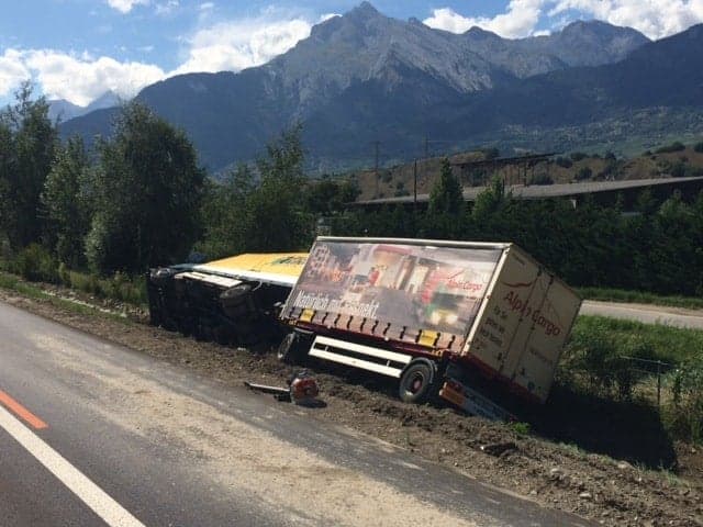 Am 27. Juli 2015 gegen 15:45, ereignete sich auf der Autobahn A9, von Siders in Richtung Martinach ein Verkehrsunfall mit einem Lastwagen. Verletzt wurde niemand.