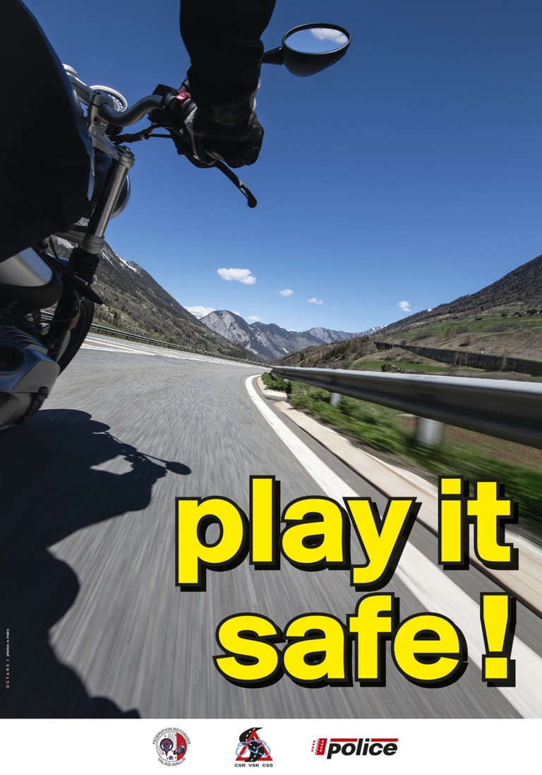 Die Kantonspolizei Wallis lanciert zudem, in Kooperation mit der Beratungsstelle für Unfallverhütung sowie dem Walliser Motorradverband, eine Plakatkampagne mit dem Titel «play it safe» – «auf Nummer sicher».